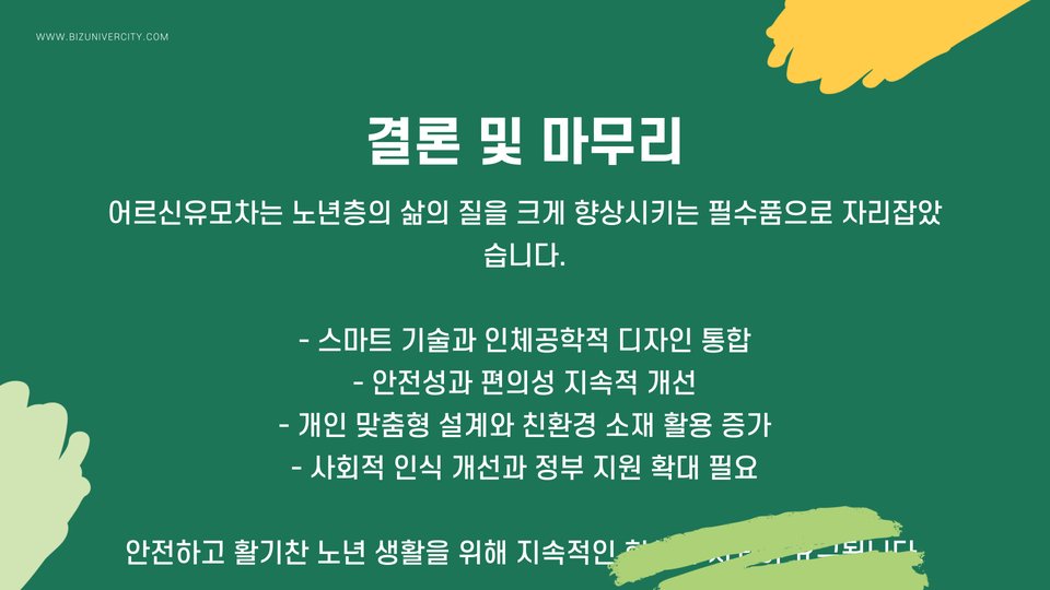 어르신유모차의 미래는 더욱 밝습니다. 기술의 발전으로 인해 다양한 기능들이 추가되고, 디자인이 더욱 세련되어지고 있습니다. 특히, 사회적 니즈를 반영한 다양한 제품이 등장하면서 노인들이 자립적으로 생활할 수 있는 환경이 만들어지고 있습니다. 이러한 트렌드는 우리 사회의 인식 변화와 함께 더욱 강화될 것입니다. 앞으로도 어르신유모차에 대한 지속적인 연구와 개발이 필요하며, 이를 통해 더 많은 어르신들이 안전하고 편리하게 외부 활동을 즐길 수 있는 날이 오기를 기대합니다.