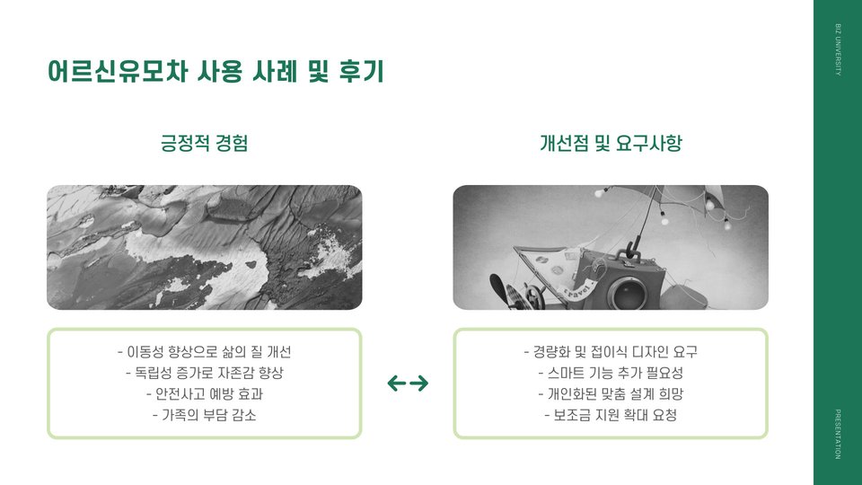- 어르신유모차 선택 시 무게, 핸들 높이 조절 기능, 디자인을 고려해야 한다.