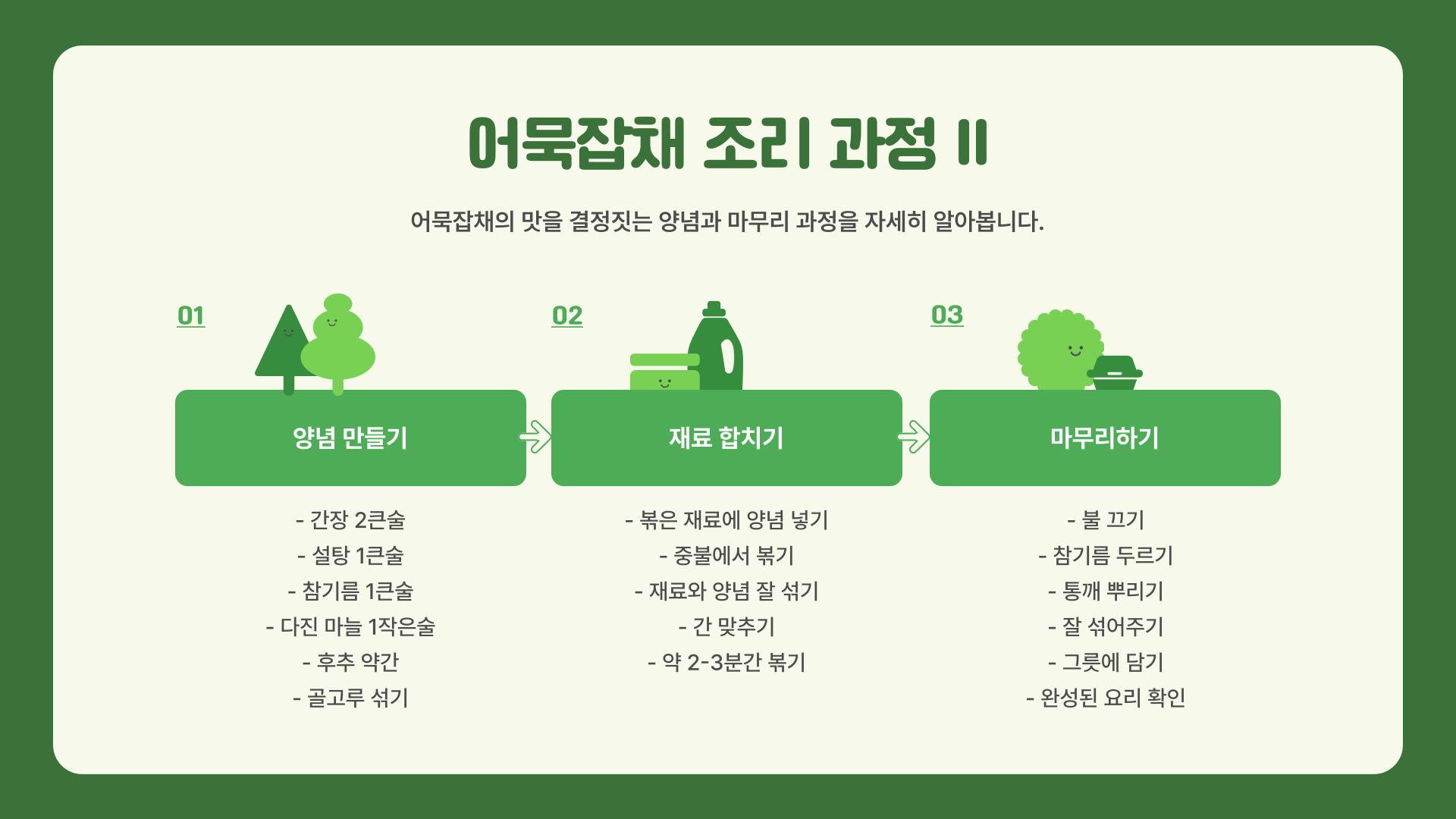 중요 팁: 어묵잡채는 다양한 재료로 변형할 수 있으니, 본인의 취향에 맞게 재료를 조절해보세요!
