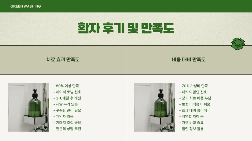 또한, 여러 병원을 방문하여 상담을 받아봄으로써 다양한 치료방법과 가격을 비교해보면 보다 나은 선택을 할 수 있습니다. 이 과정에서 얻은 정보는 피부과 치료의 최종 결정을 내리는 데 큰 도움이 될 것입니다. 결국 너무 저렴한 가격만을 추구하기보다는, 전문 의사의 조언과 경험을 바탕으로 판단하는 것이 바람직합니다.