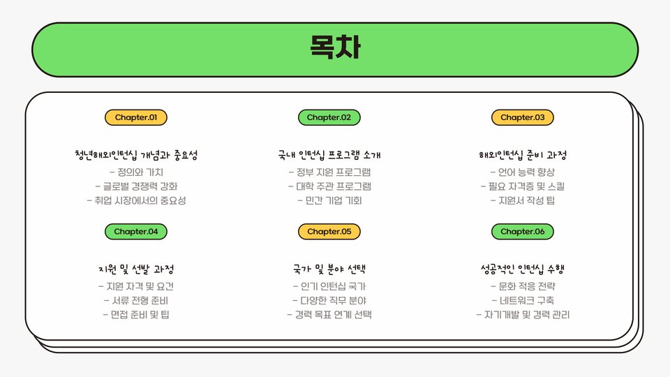 청년해외인턴십은 청년들에게 국제적인 경험을 제공하고, 진로 개발에 큰 도움이 되는 프로그램입니다. 성공적인 인턴십을 위해서는 철저한 준비와 실행, 그리고 지속적인 자기 계발이 필요합니다. 이를 통해 글로벌 인재로 성장할 수 있는 기회를 얻게 되기를 바랍니다.