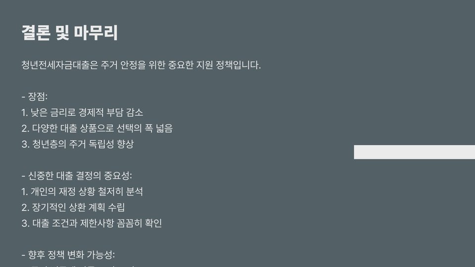 위의 내용을 바탕으로 청년버팀목전세대출에 대한 전반적인 이해를 돕기 위한 정보를 제공하였습니다. 이 대출 제도를 활용하여 더 나은 주거 환경을 만들어 나가는 데 도움이 되길 바랍니다.