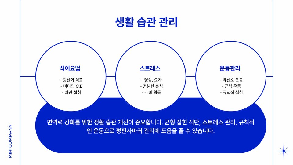 가장 중요한 점은 예방이 최선의 치료라는 것입니다. 개인 위생을 철저히 지키고 면역력을 강화하는 생활습관을 유지한다면 평편사마귀가 발생할 위험을 줄일 수 있습니다. 연고 사용 시에는 효과적인 관리가 필요하니, 전문가의 조언을 듣고 사용해야 합니다.